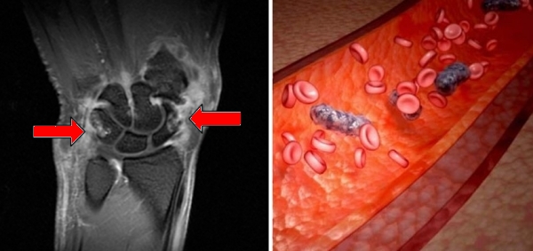 Stânga: RMN al genunchiului. Dreapta: Demonstrarea dimensiunii particulelor de depozite articulare care intră în fluxul sanguin.